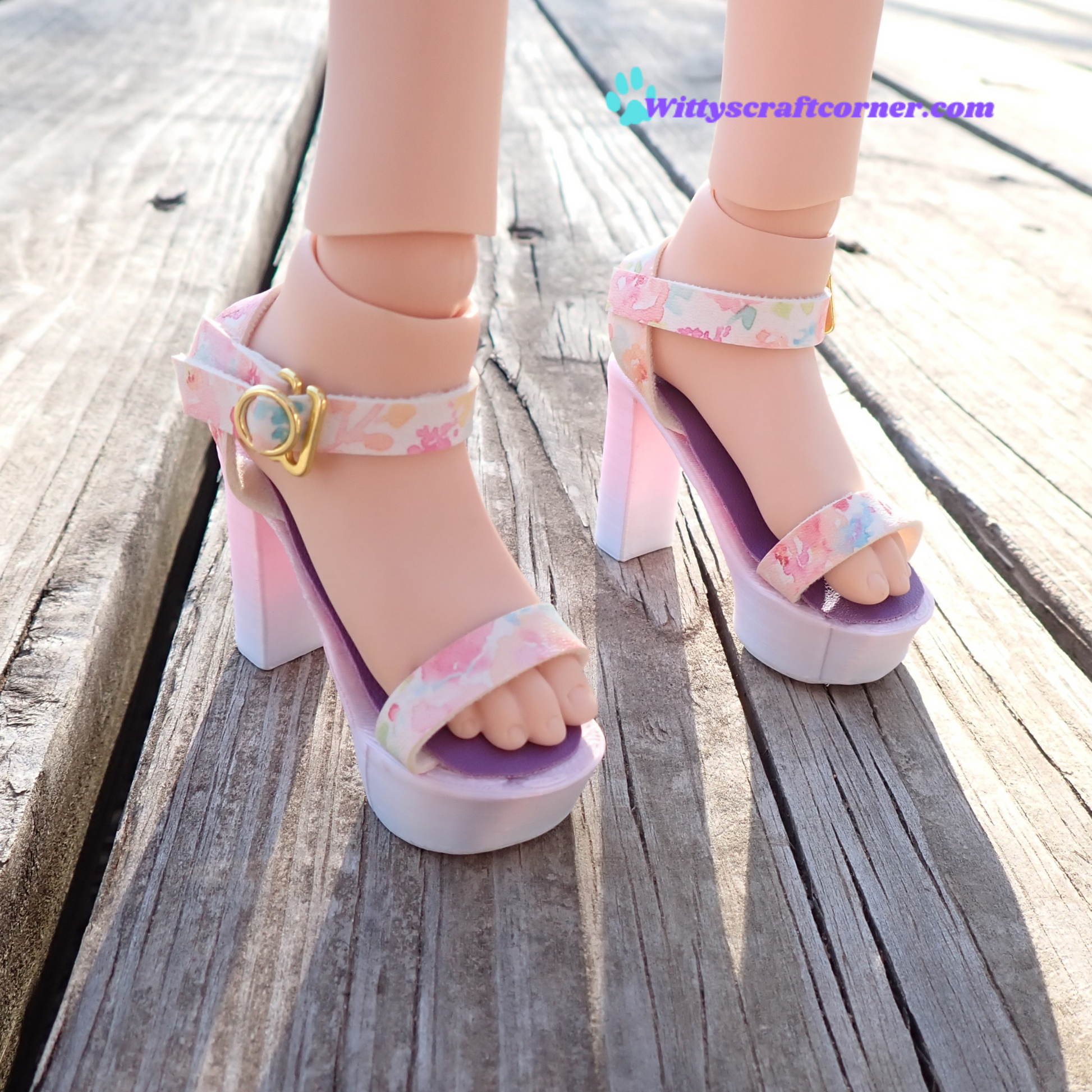 These smart doll chunky heels have heel bases printed from a pearl purple PLA. The straps are made of a white floral faux leather. These heels feature a cute golden round buckle. The shoes are very easy to get on and off, with a hook that hooks right in front of the buckle (pictured for reference) Strap may need to be tightened slightly for flat feet.