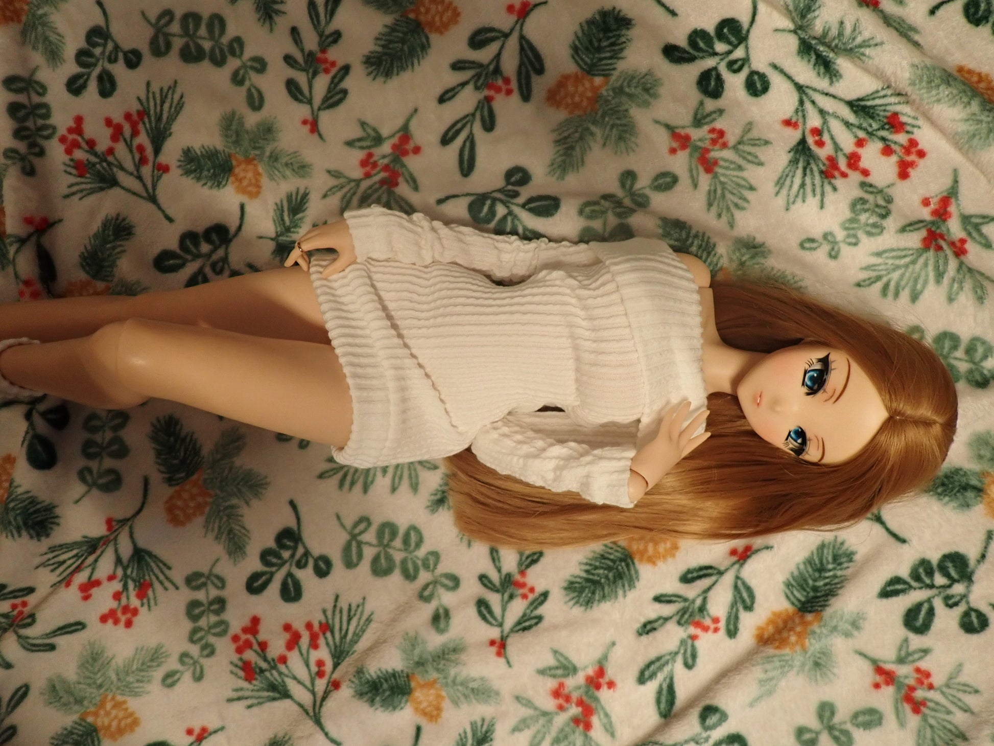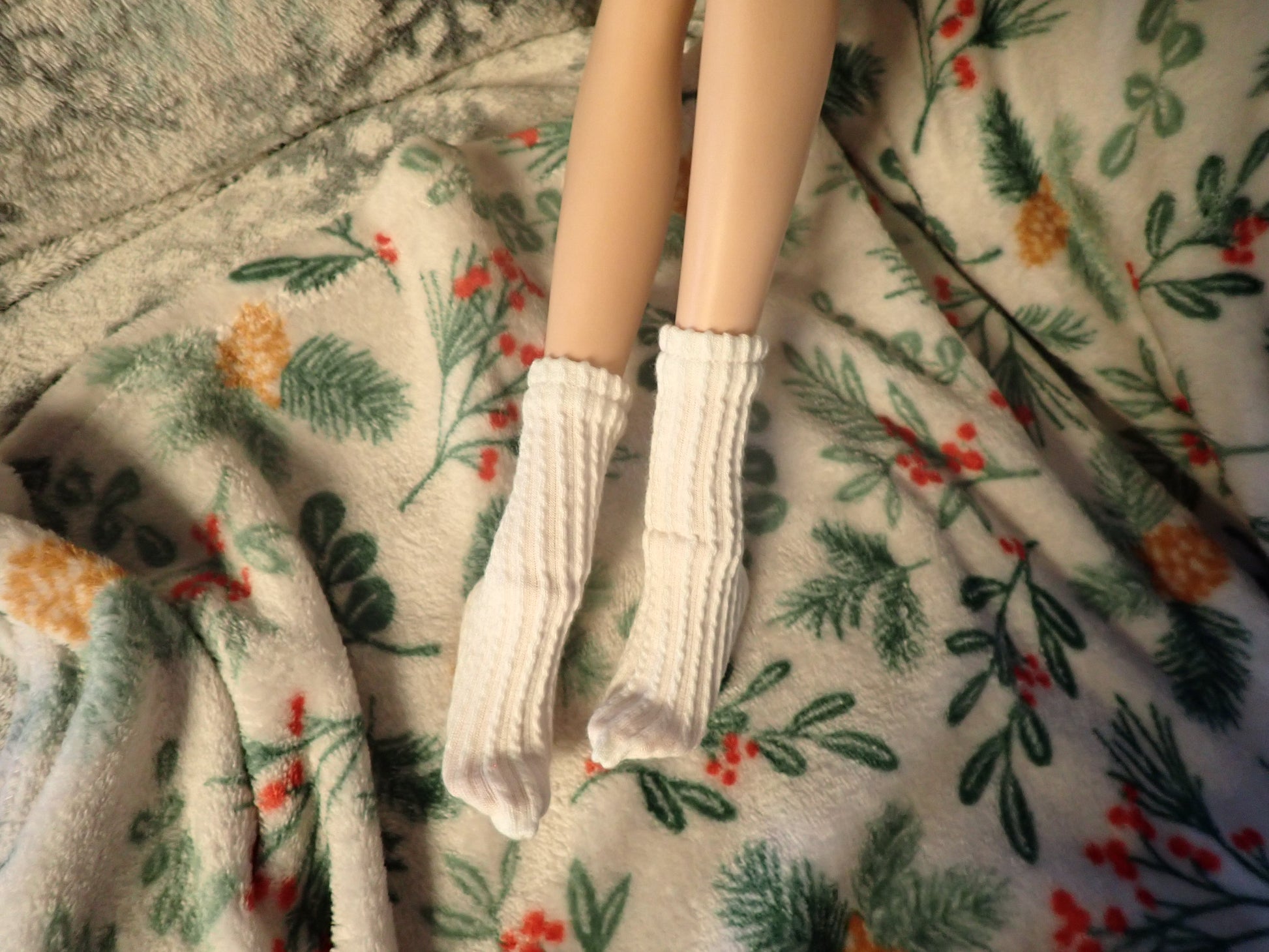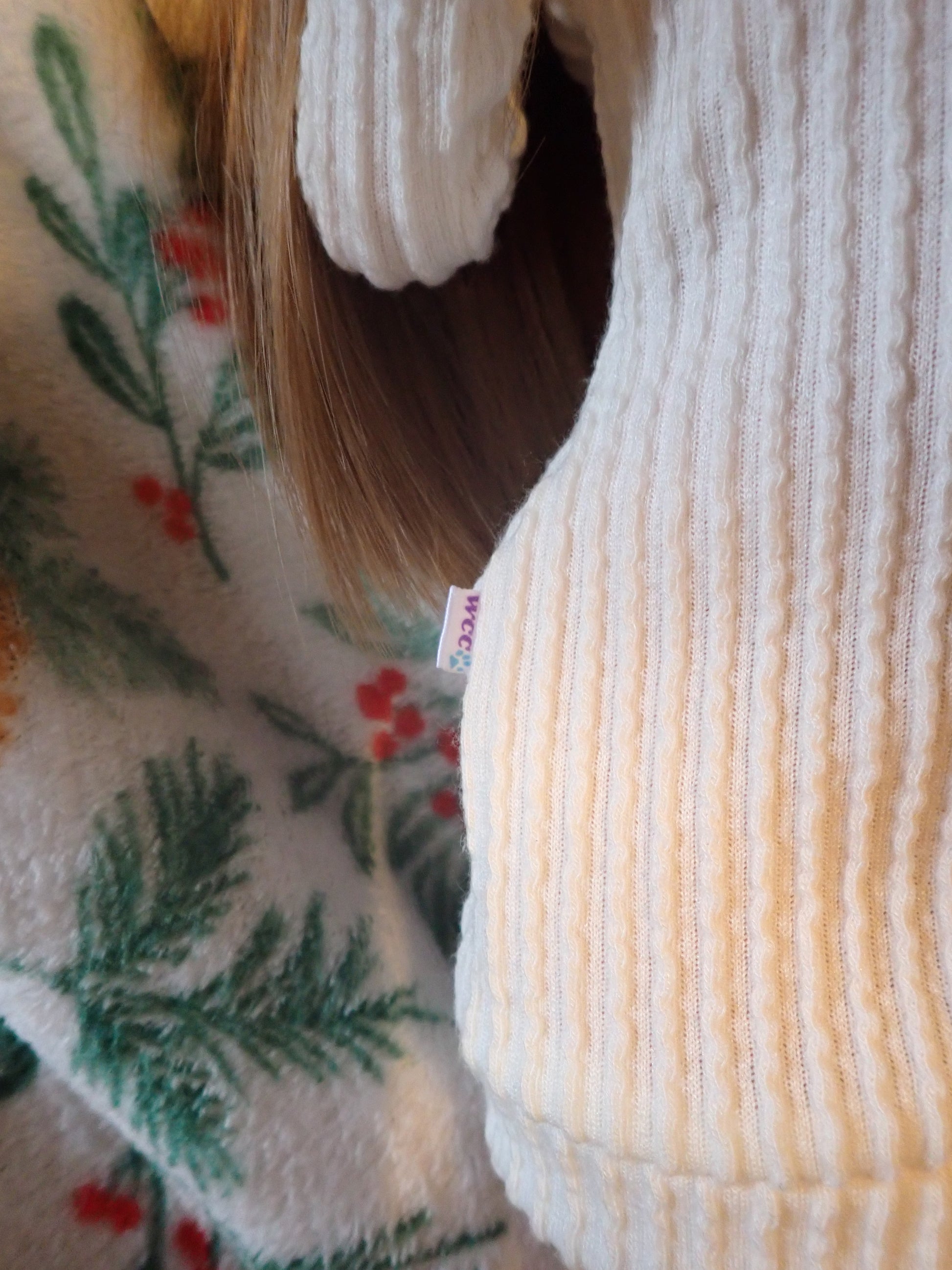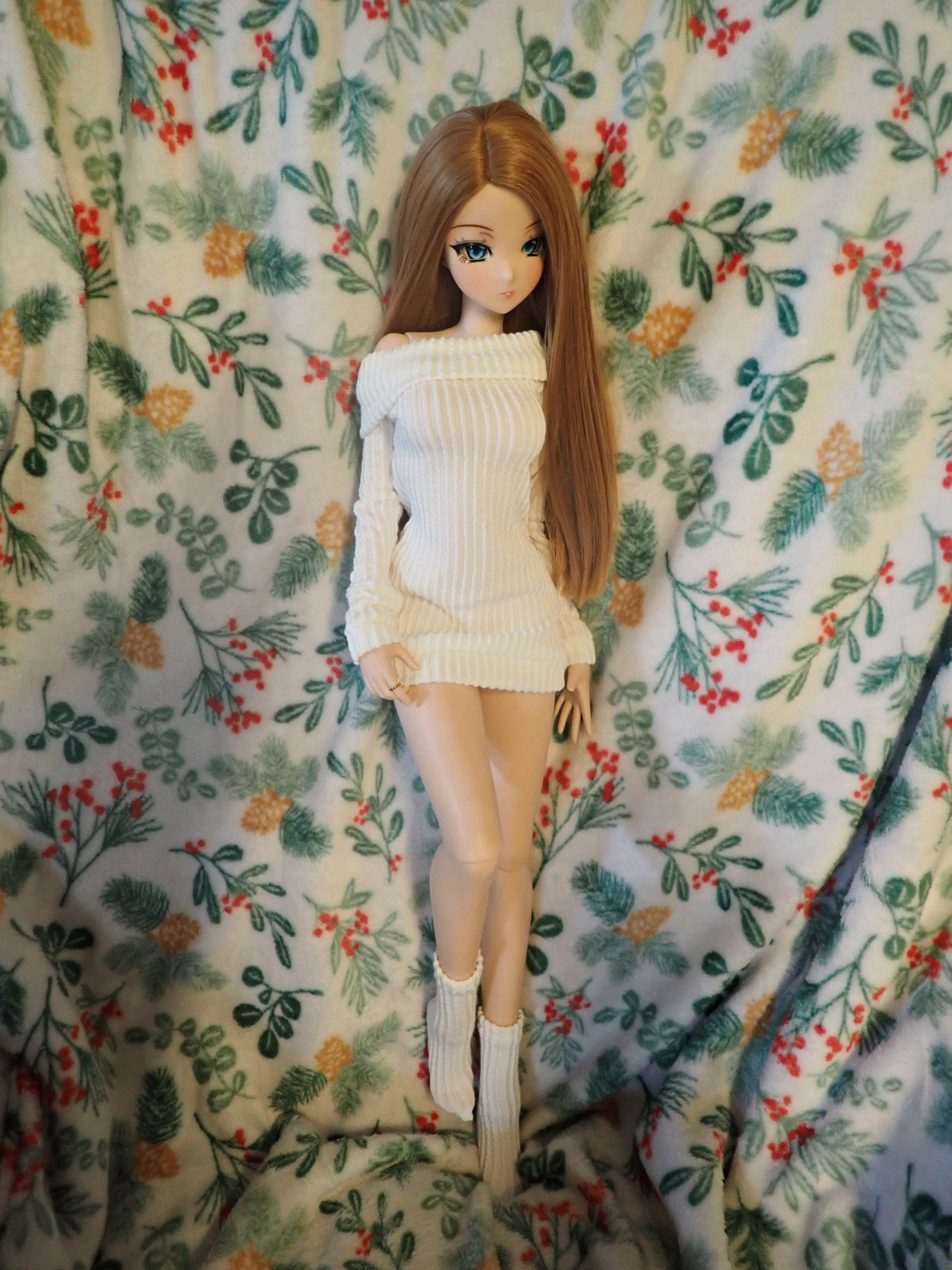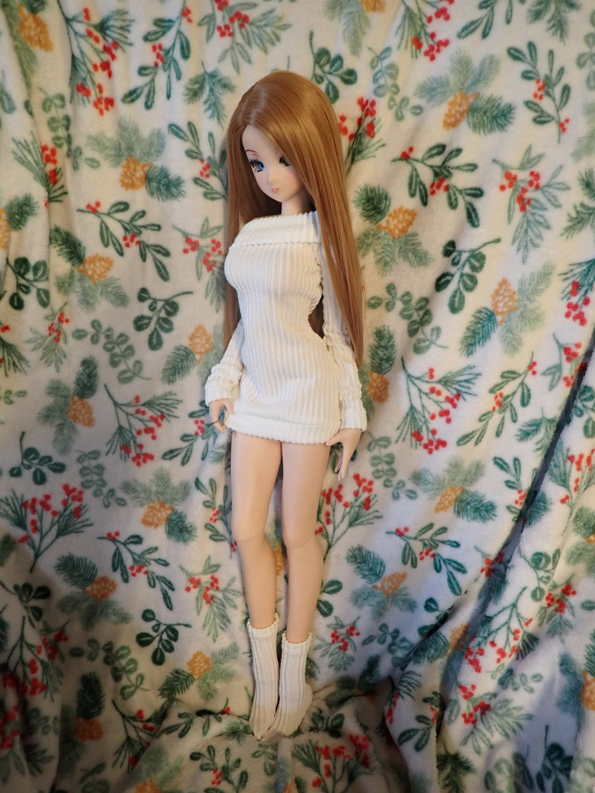This sweater dress is made of a super stretchy ribbed knit fabric in a lovely off white color. It even comes with a cute little matching pair of socks! This outfit is sure to keep your girls nice and cozy while they lounge inside during the winter months. Inspired by Smart Doll's room socks and sweater set.