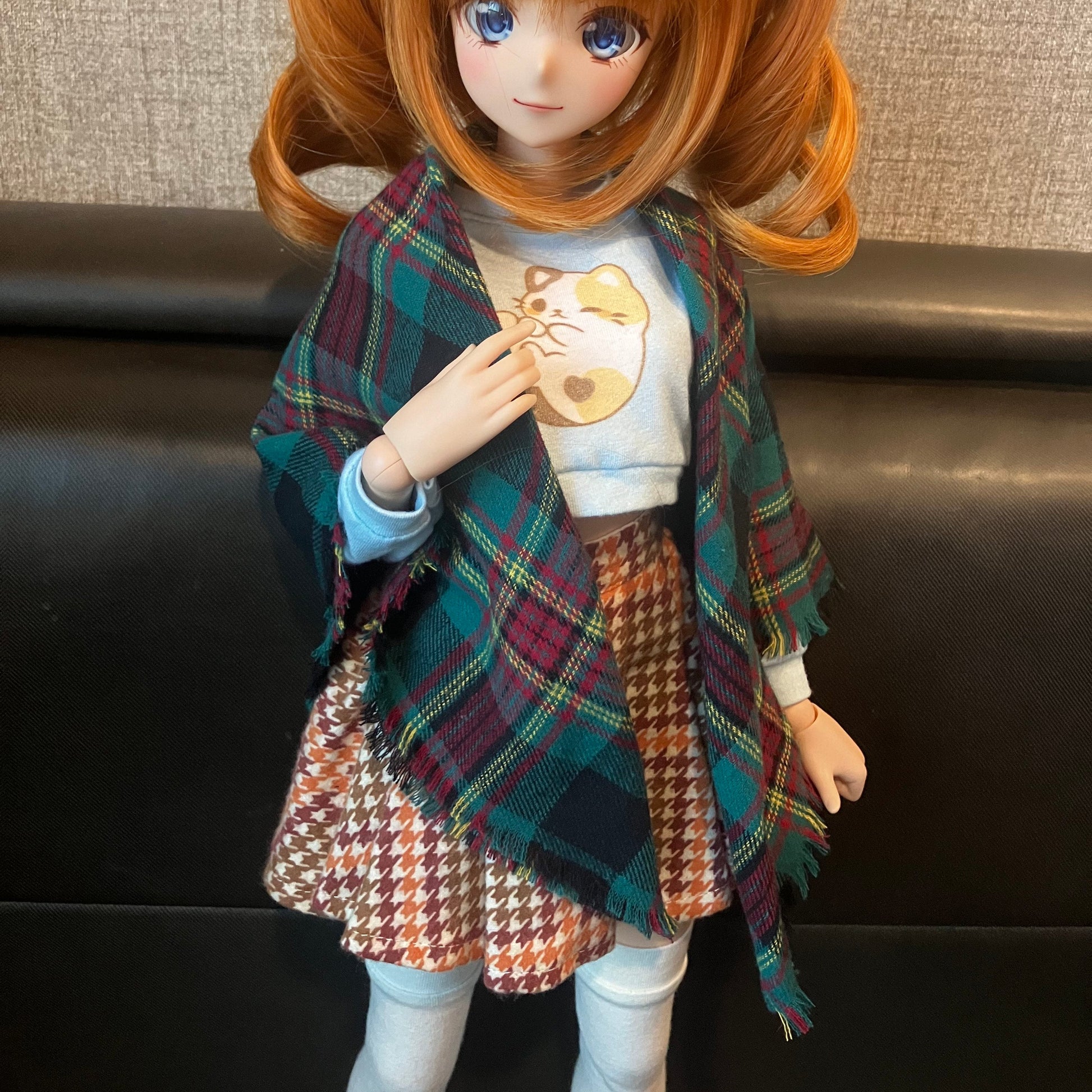 This shawl is made of a super soft and cozy flannel fabric with a red and green plaid print. This is the perfect piece to keep your Smartie warm during fall/winter! Pair it with a sweater and your dolls are ready for the day! This shawl is made in a triangular design. Fold the square in half (from corner to corner) and drape it over her shoulders. This shawl could also be wrapped around the neck for a super chunky scarf if you wish.