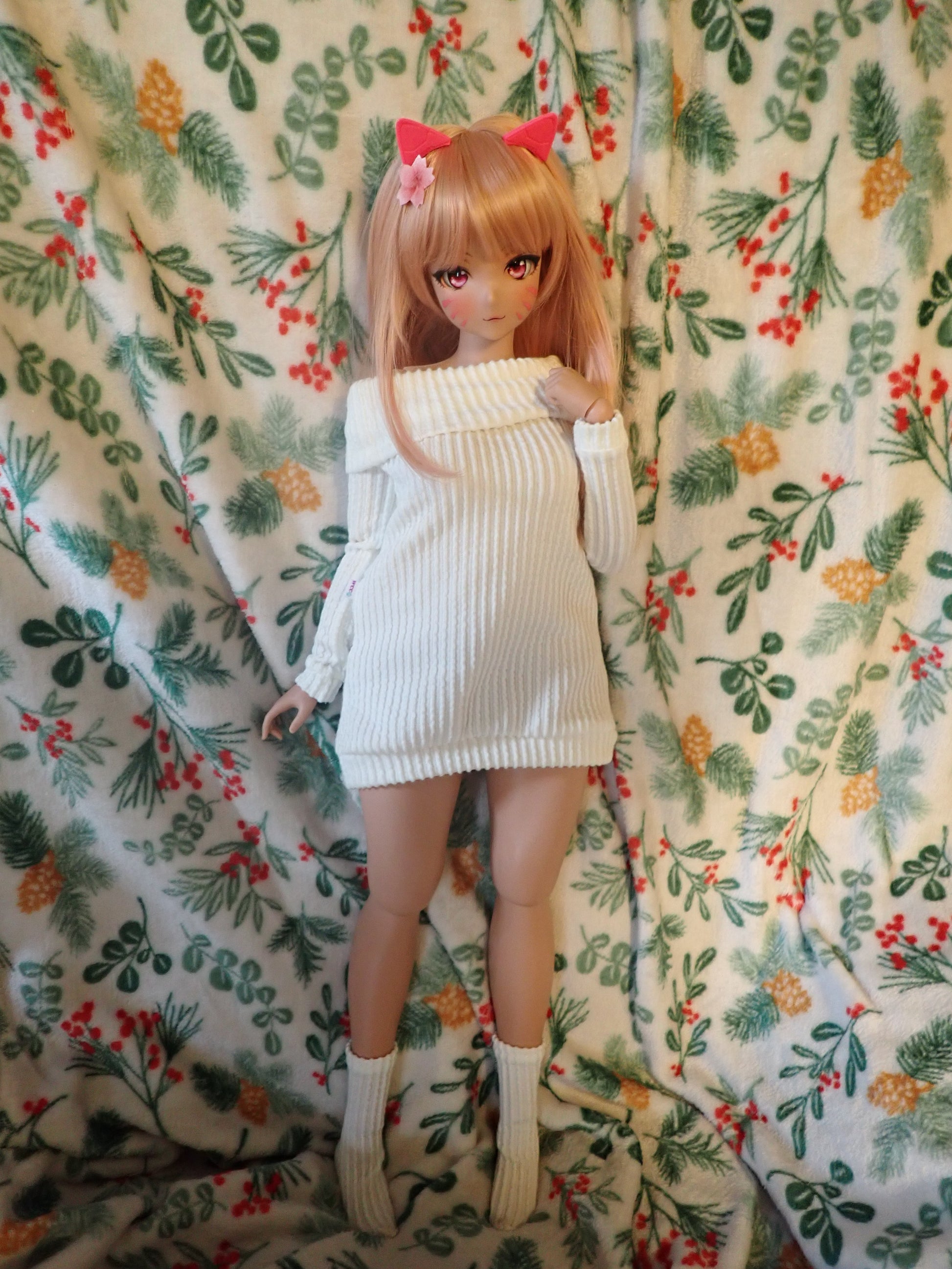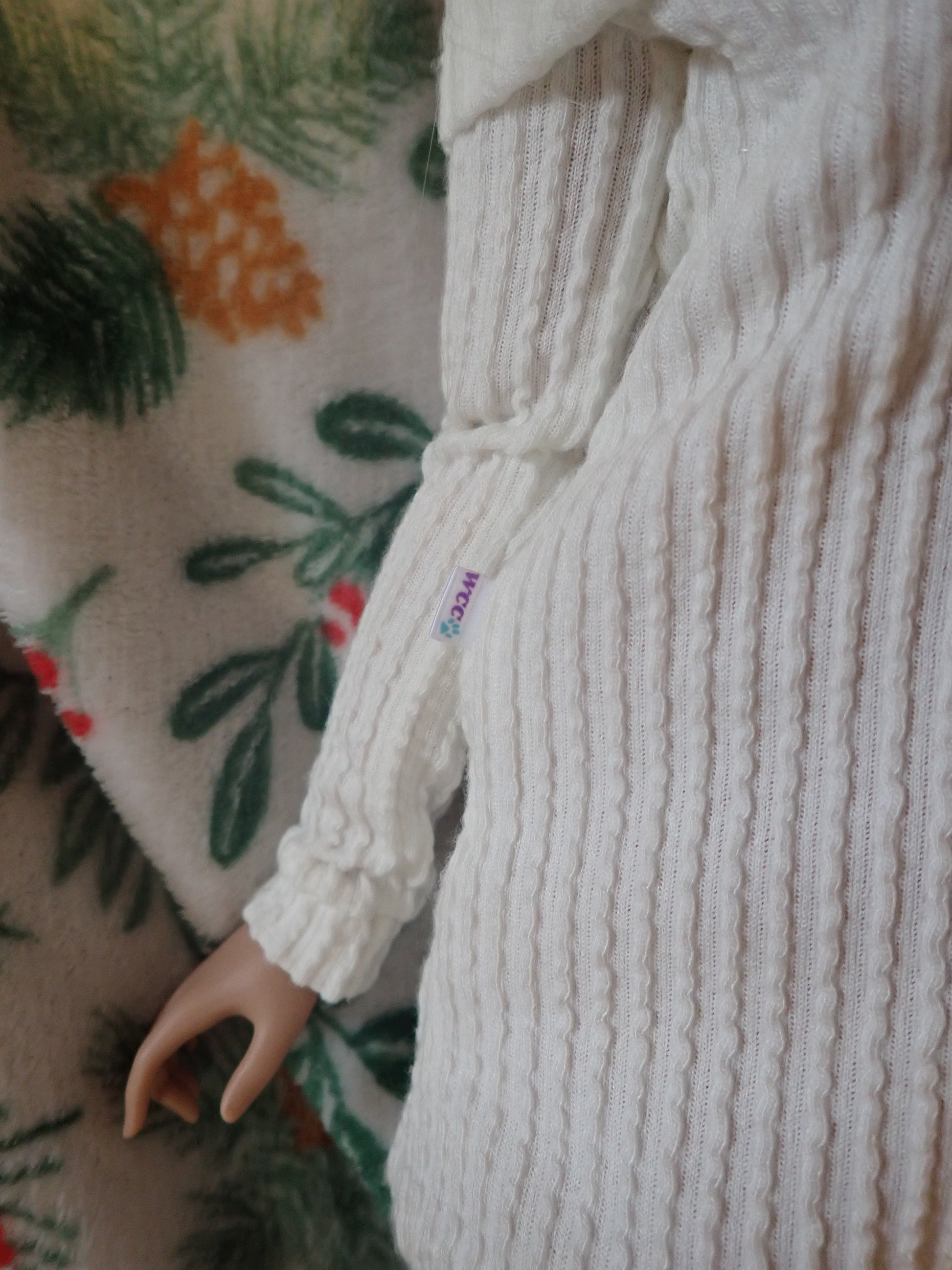 This sweater dress is made of a super stretchy ribbed knit fabric in a lovely off white color. It even comes with a cute little matching pair of socks! This outfit is sure to keep your girls nice and cozy while they lounge inside during the winter months. Inspired by Smart Doll's room socks and sweater set.